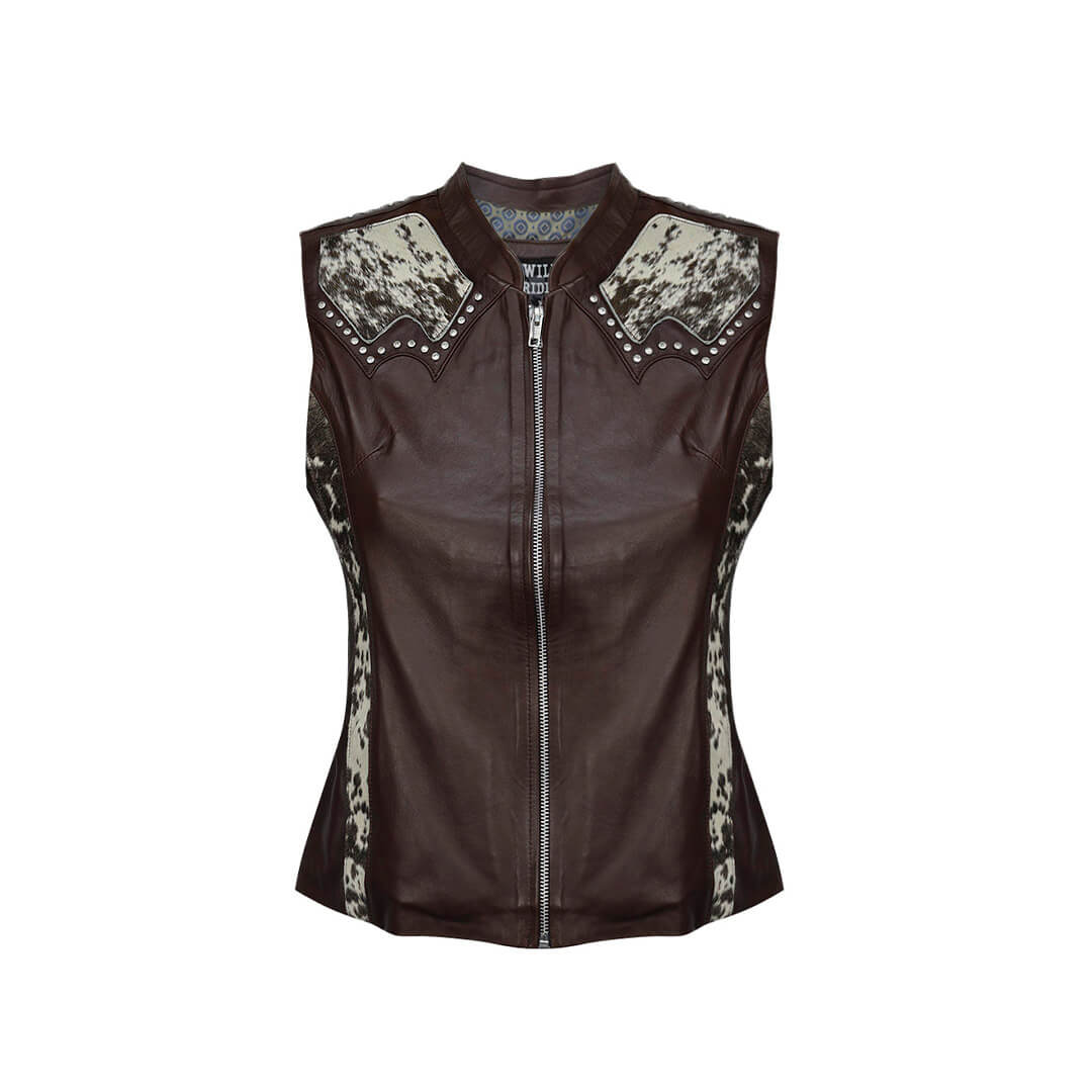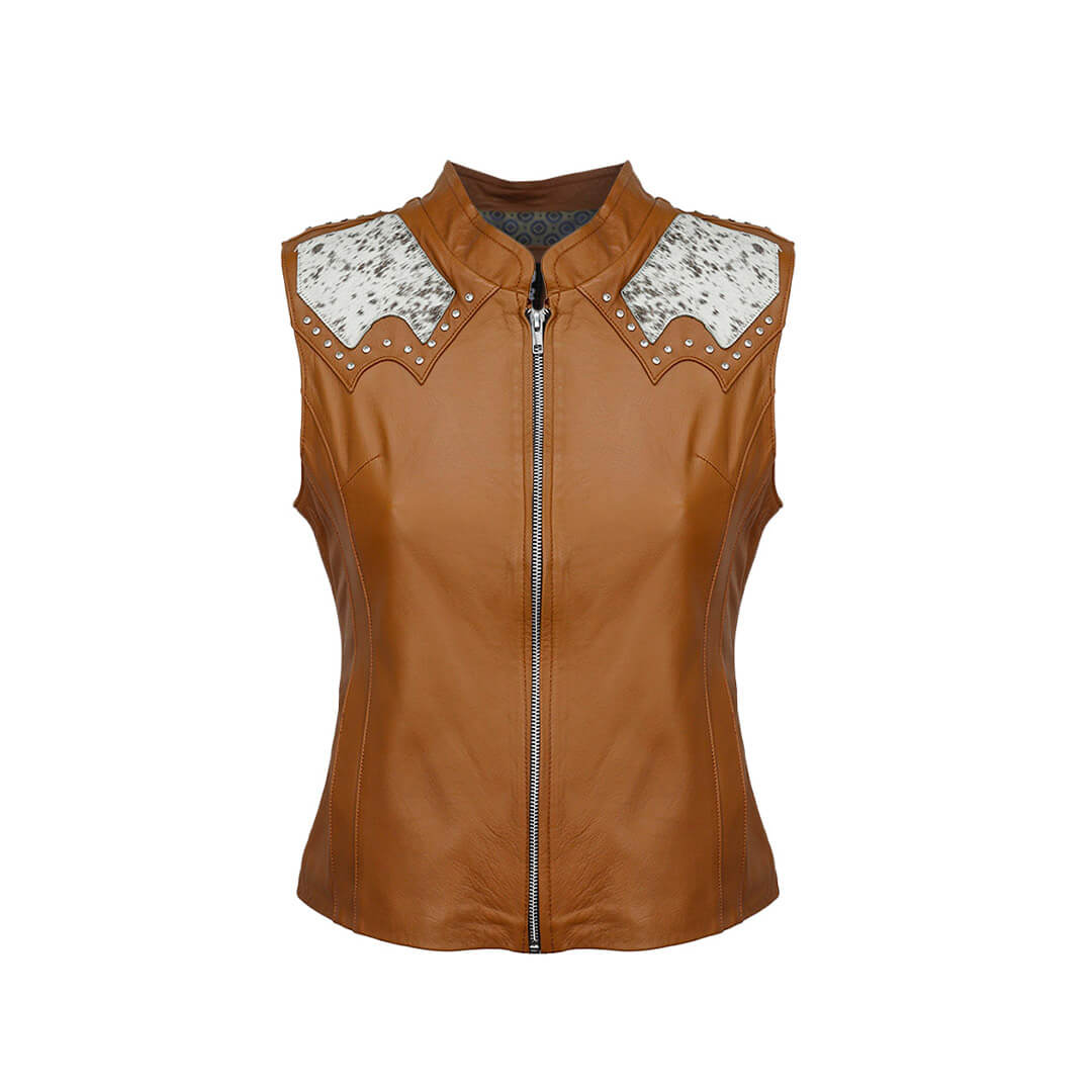 Nuestro chaleco de dama con doble pespunte con aplicación de pelo de vaca está fabricado con piel de borrego auténtica de excelente calidad. Su resistencia y durabilidad garantizan que te acompañará durante años. El corte ajustado te brinda un estilo elegante sin sacrificar la comodidad, y su forro interior que se adapta a cualquier clima.